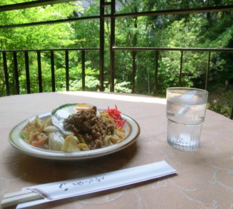 湯河原のB級グルメ「担々やきそば」も観光会館4Fのパノラマラウンジで召し上がれます。昔、狸が見つけた湯河原の温泉がありまして、それにあやかる形で考案されました。ピリ辛の焼きそばに、目玉焼きがのせてありました。なお、アレンジや辛さはお店によって若干異なるそうです。ここはサービスが良かったので、宣伝させてください。あまり辛すぎず、ボリュームもありました。テラス席では滝の音がよく響き、木々の緑とともに情緒豊かに召し上がることができました。担々やきそば650円。