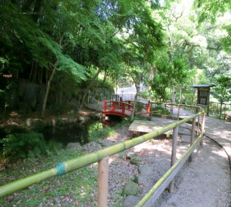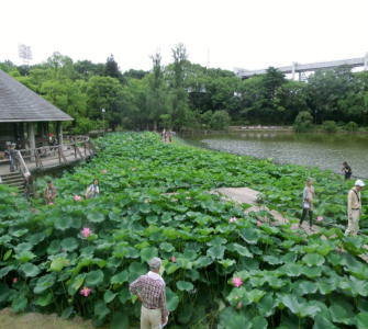 仮設展望台から。左側にあるのは、蓮華亭で、大賀ハスに関する資料などが展示されています。