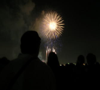 うちがスポンサーになった調布市の花火大会。今まで上石原の方で眺めていただけに、河川敷の協賛席に座って観れたことは、なんか感動的でした。ここでは、音楽も流れていて、屋台もあり、盛り上がりがありました。なかでも見物は、ナ イアガラの滝花火でした。長いランスをクレーンで釣り上げるのですが、打ち上げと違い、光が滝を流れるように輝き、一風変わっていました。 |