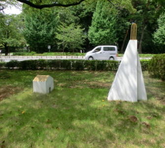 国立の大学通りで行われた公募の野外彫刻展。いくつか作品が展示されてありましたが、こちらが私が気に入った長野真紀子さんの「記憶のひきだし」という作品。左の小さい家によって、故郷の思い出を呼び起こす趣旨の創作。分かる 人には分かると思います。 |